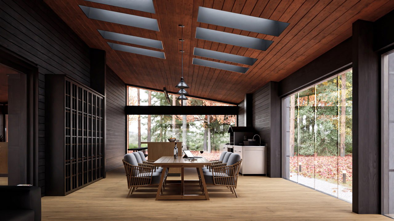 Интерьер и экстерьер не соперничают: между ними нет границы. Пространство перестаёт делиться на «внутри» и «снаружи», становясь единой средой — тёплой, защищённой и естественной.
